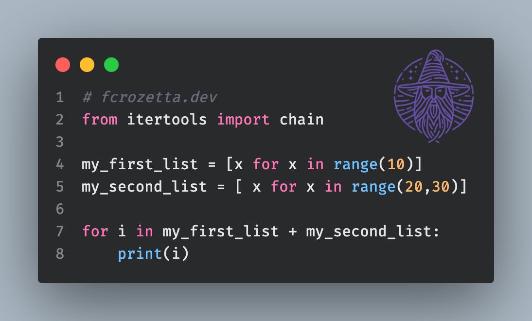 Which may look ok, but has some issues underneath. First, we need to load both lists in memory (lines 4 and 5), instead of reading as required. This approach may work for small lists, but it is not the best approach. What should we do instead? itertools.chain.