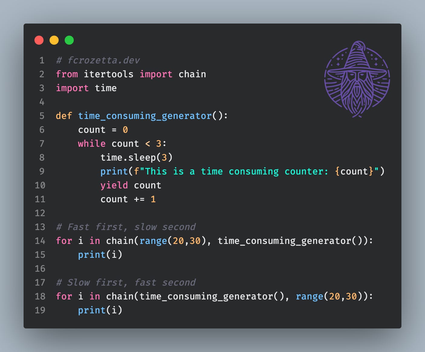 The chain function allow us to pass an infinite number of iterables and instead of forcing it to be always in memory, we yield numbers as needed. This way, while we are processing the first list, the other lists are left untouched. Let's mimic a time time consuming generator, to see this in action: