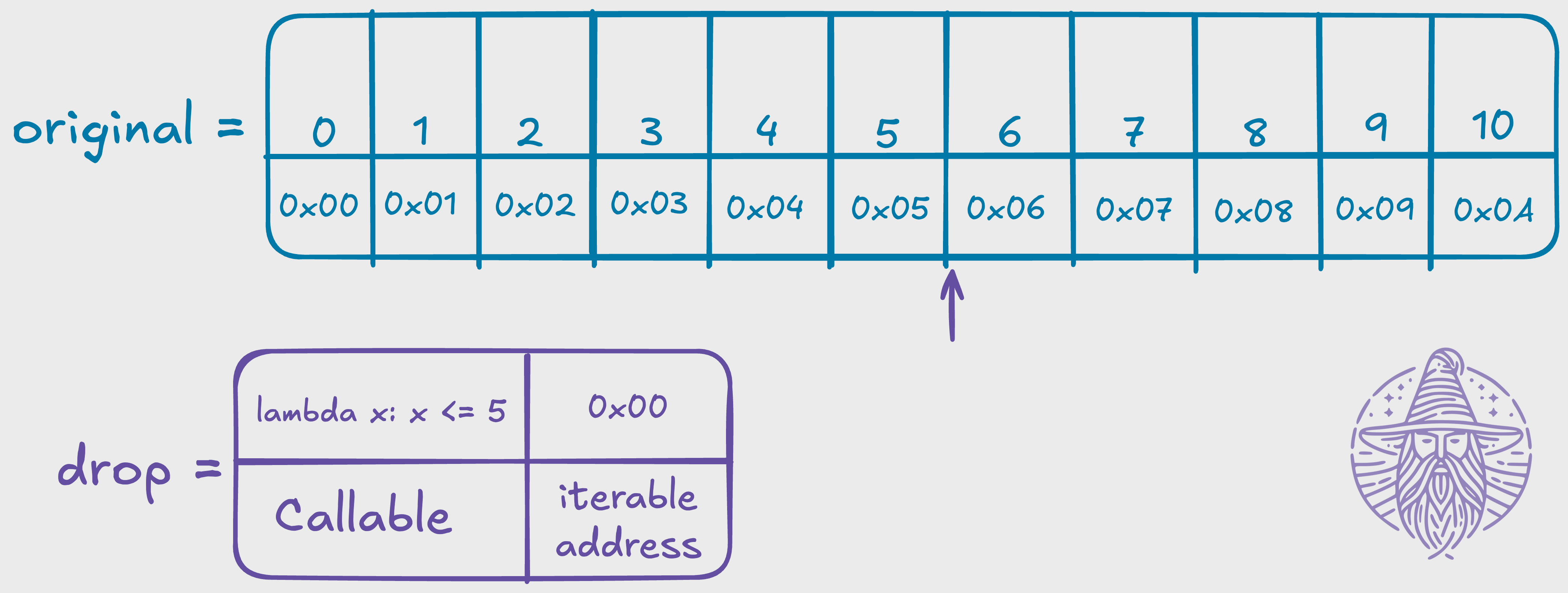 Then, by calling next(drop), we would have a pointer moving forward until we reach position 0x06, which is the first value that is higher than 5, in the sequence: