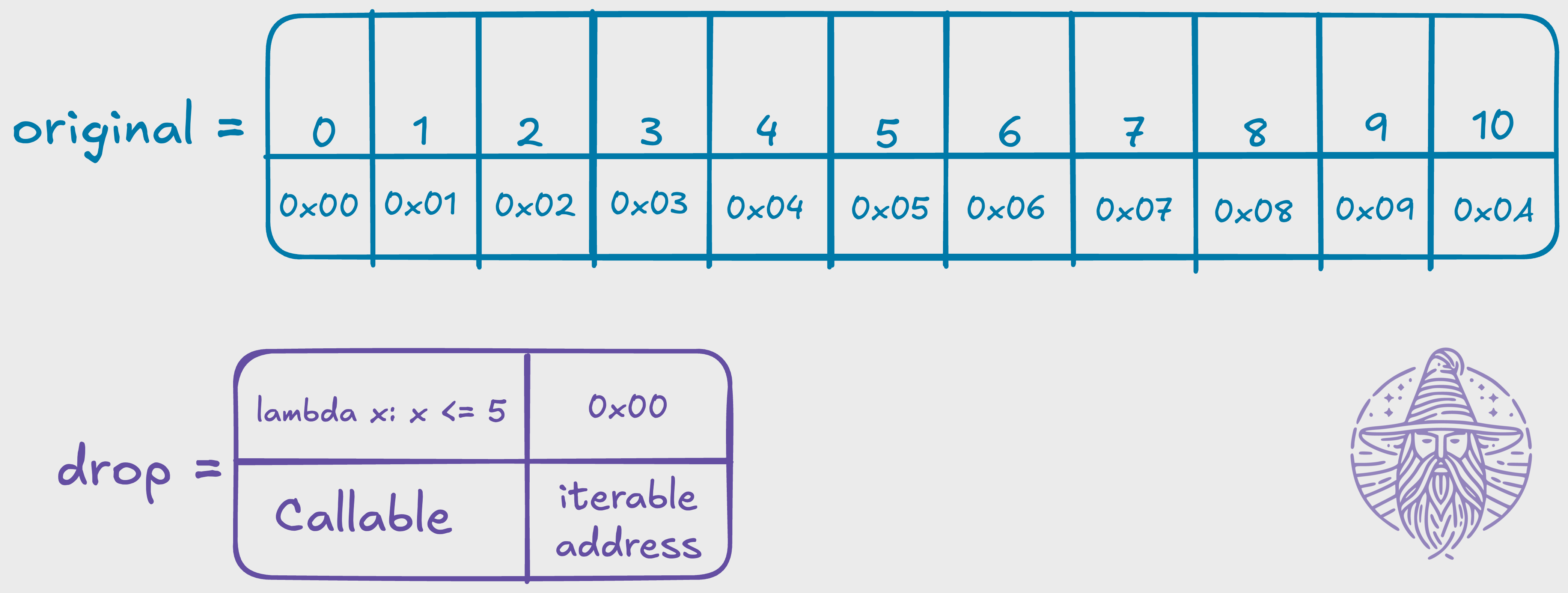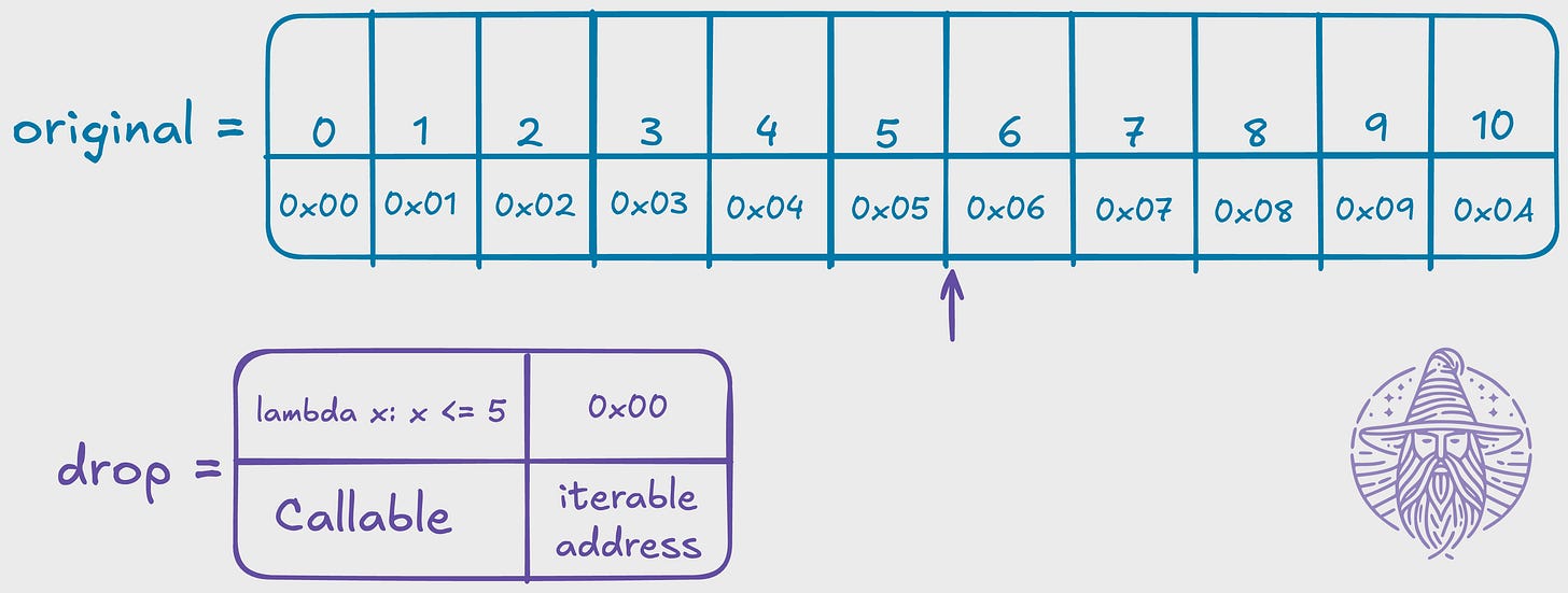 drop = dropwhile(lambda x: x <= 5, original)at this point in time, in memory, you will have something like this:
